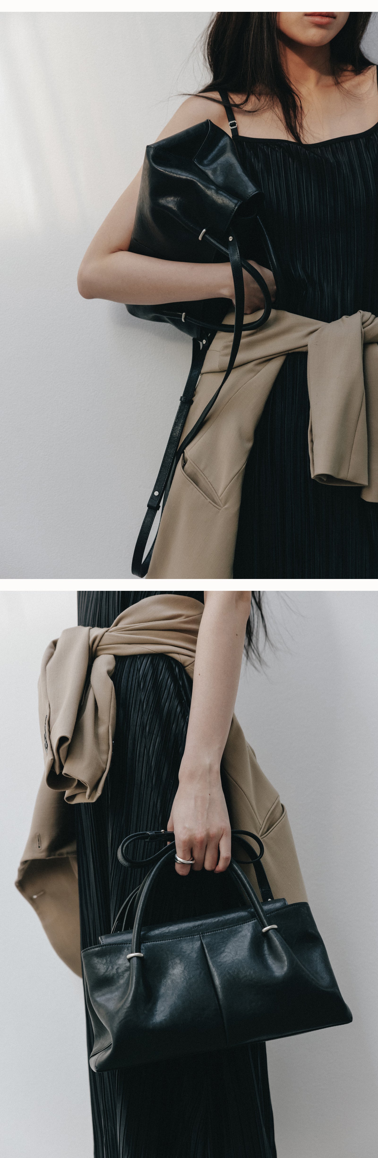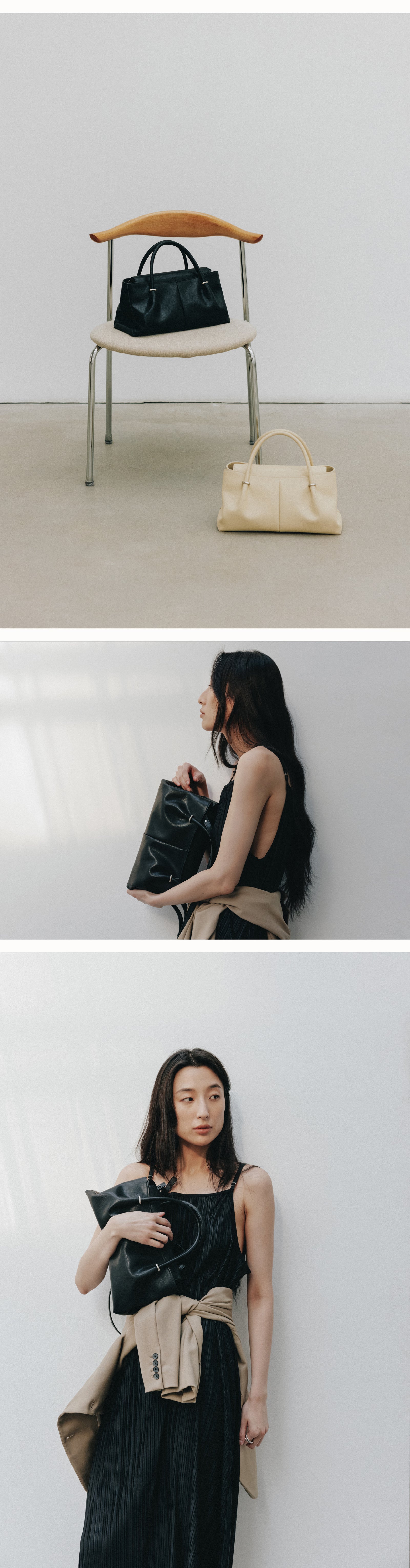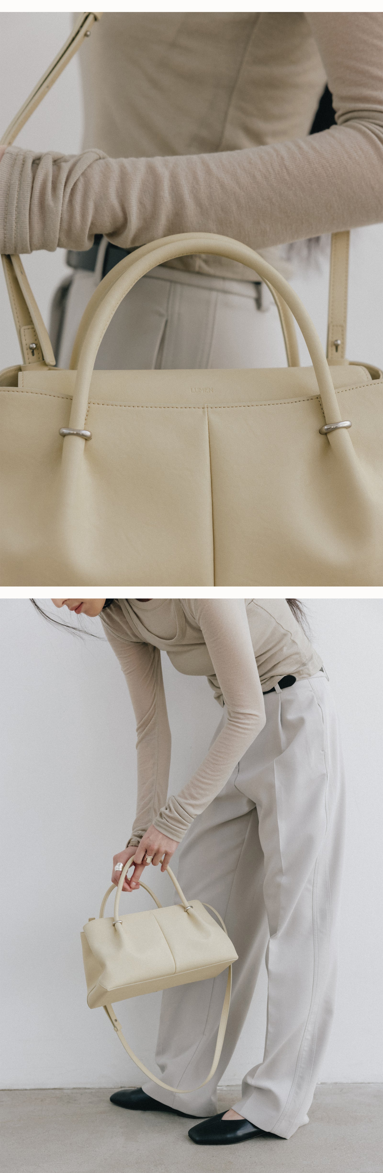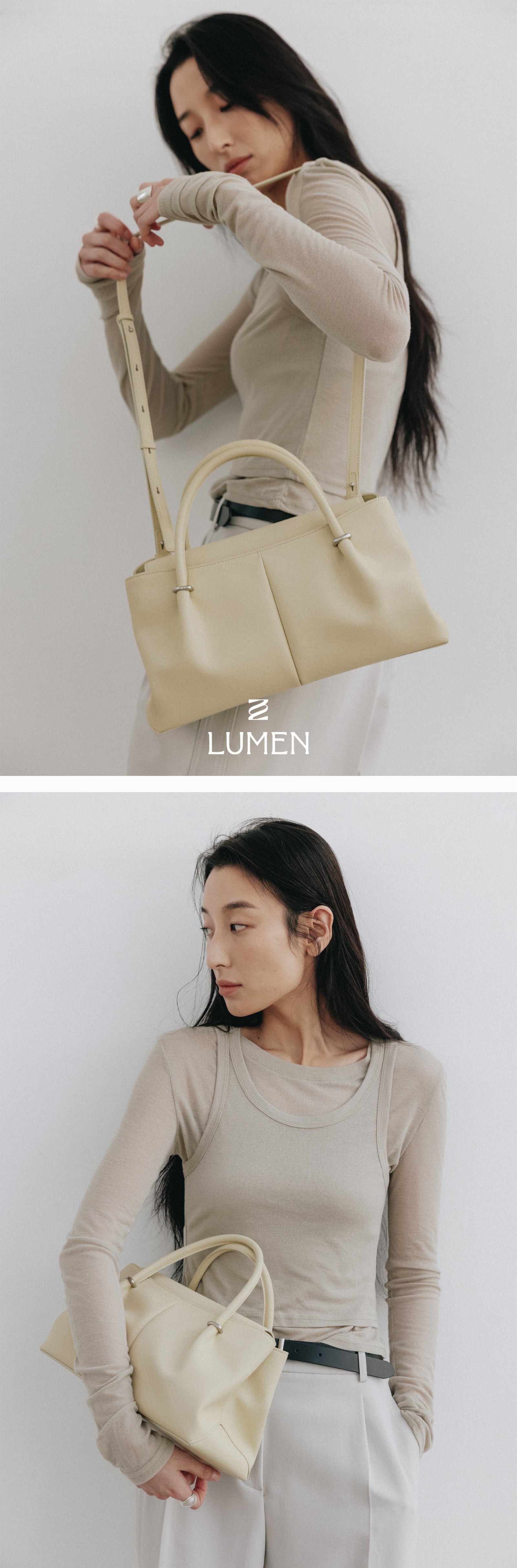This is the Anneau flap bag, which stands out with its unique handle finish and voluminous shape. The handle detail using the Lumen development ring decoration naturally leads to a puffy appearance. The magnetic cover closure and the interior, which is divided into two large compartments, are practical, and the spacious feeling and zipper pocket allow for comfortable use. It is a product that matches various moods from everyday casual looks to office looks. The detachable strap allows for various styling as a shoulder bag and cross bag.