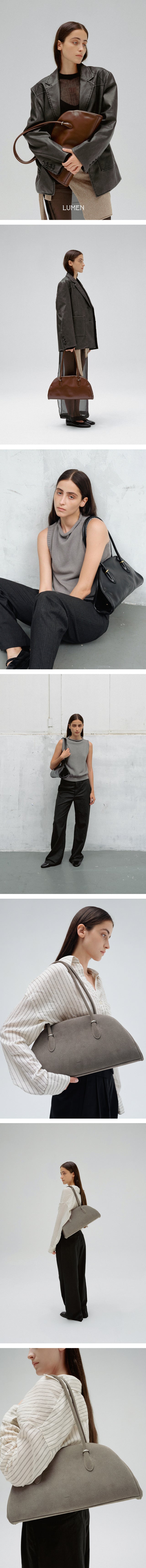 The Anneau Frame bag is a captivating combination of soft curves and a centrally located frame. The name, "Anneau" in French, means "ring" or "hook," reflecting the silhouette and mood of Lumen's proprietary metal ring decoration. It adds subtle accents to the simple silhouette and monotonous materials, and its shoulder bag design supports the relatively long strap, adding stability. The interior is lined with leather to prevent direct metal exposure, and the frame's gently curved design completes the sleek design. A central kisslock pocket divides the main pockets on either side, creating three separate compartments for maximum practicality. Available in two styles: a suede version with a luxurious color and soft texture, and a leather version with a more glossy texture.