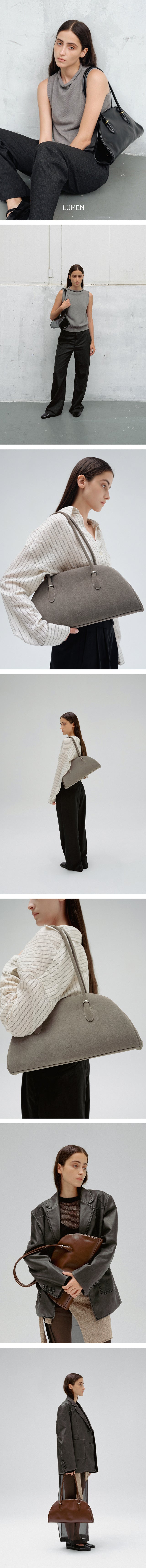 The Anneau Frame bag is a captivating combination of soft curves and a centrally located frame. The name, "Anneau" in French, means "ring" or "hook," reflecting the silhouette and mood of Lumen's proprietary metal ring decoration. It adds subtle accents to the simple silhouette and monotonous materials, and its shoulder bag design supports the relatively long strap, adding stability. The interior is trimmed with leather to prevent direct metal exposure, and the frame's gently curved design completes the sleek design. A central kisslock pocket divides the main pockets on either side, creating three separate compartments for maximum practicality. Available in two styles: a suede version with a luxurious color and soft texture, and a leather version with a more glossy texture.