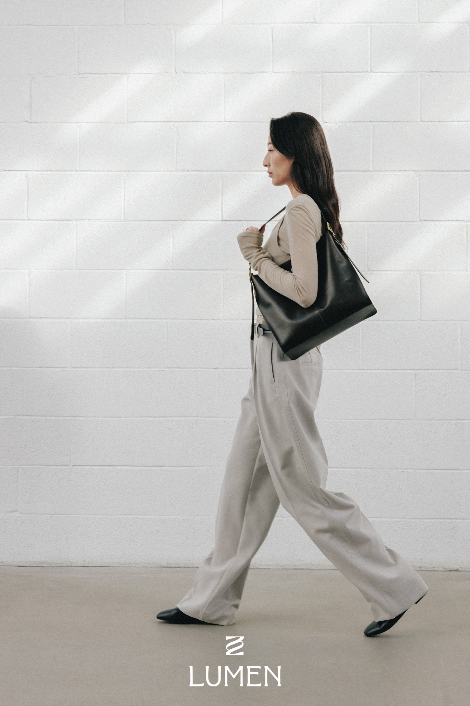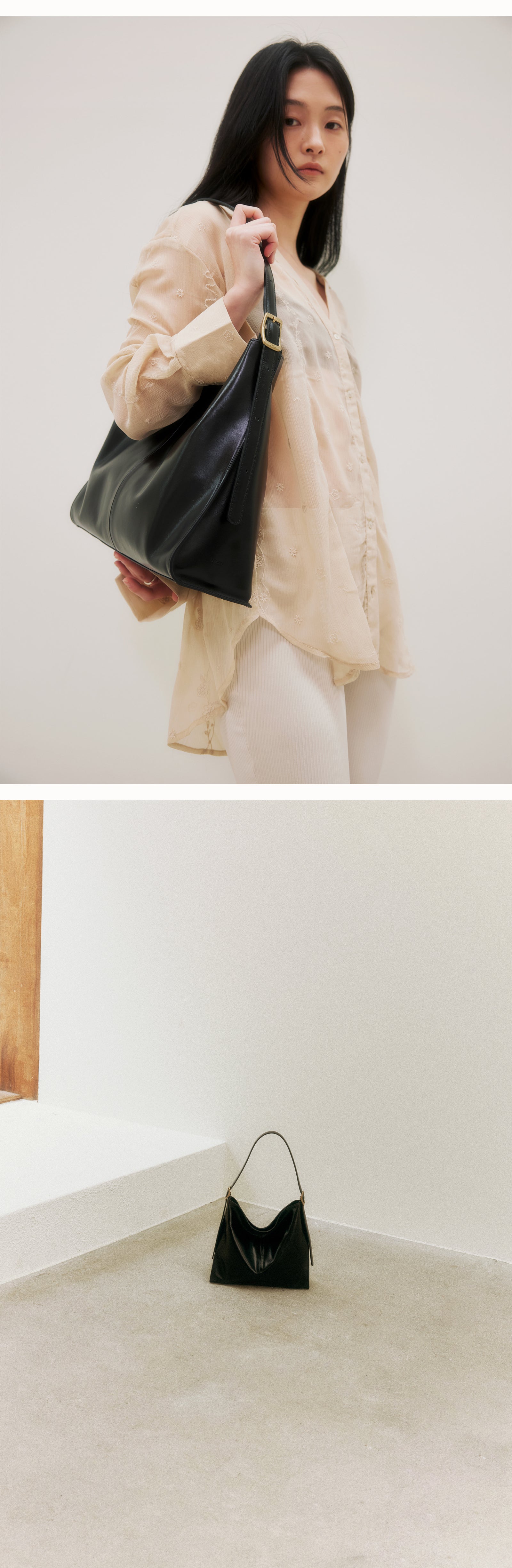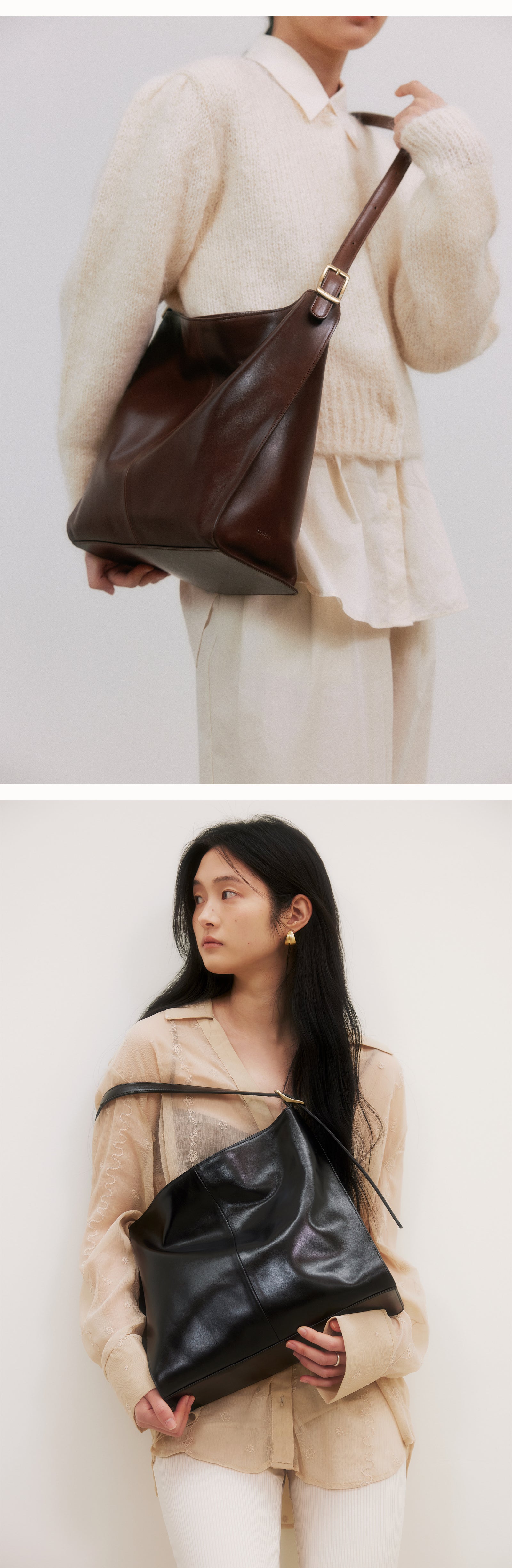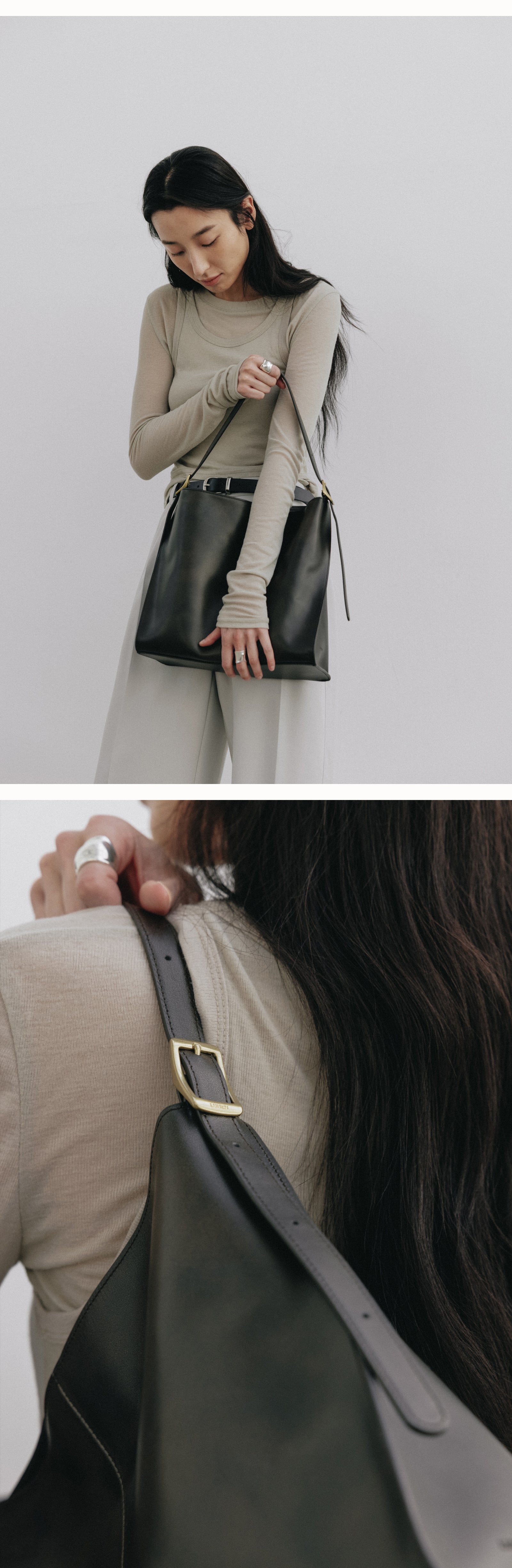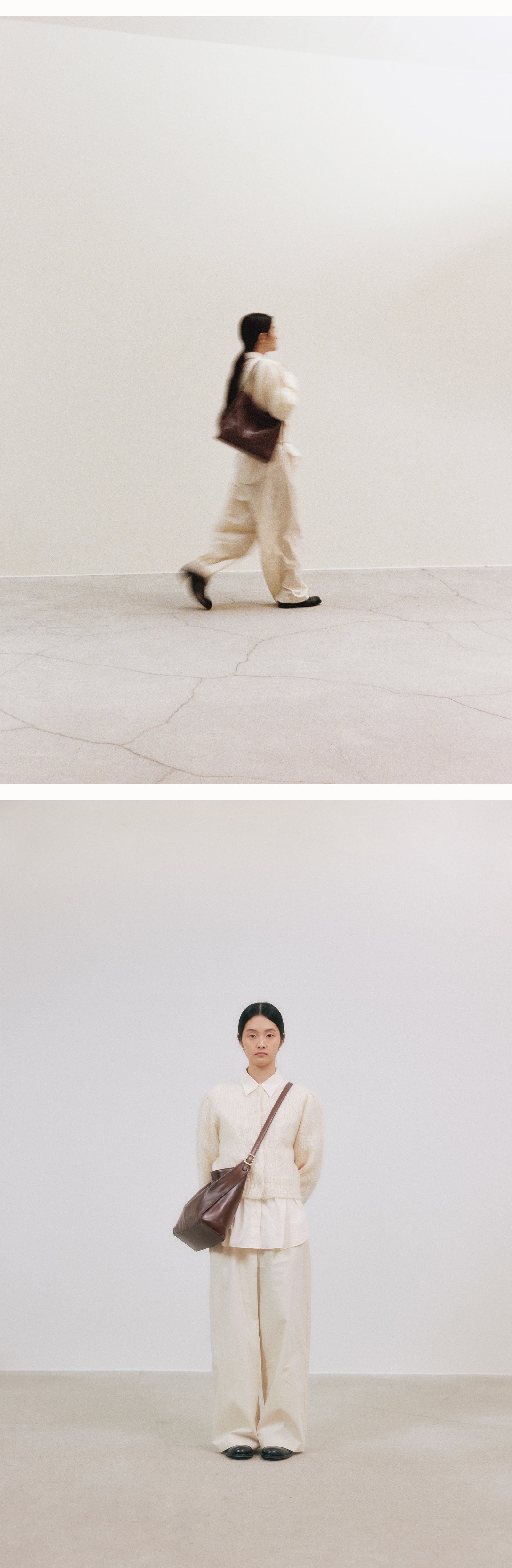 It is an Arete bag that highlights the asymmetric structure of the front and back plate by making an oblique incision on the side.Arete is a French word that means the angle that forms the tangent of a place. The Arete bag is valuable for collection with its cleanliness and unique design.Soft natural oil pull-up cowhide adds style with a subtle luxurious sheen and a natural slick design. It is a good size to use as a daily bag because it can store enough iPads.You can wear it from shoulder to cross.