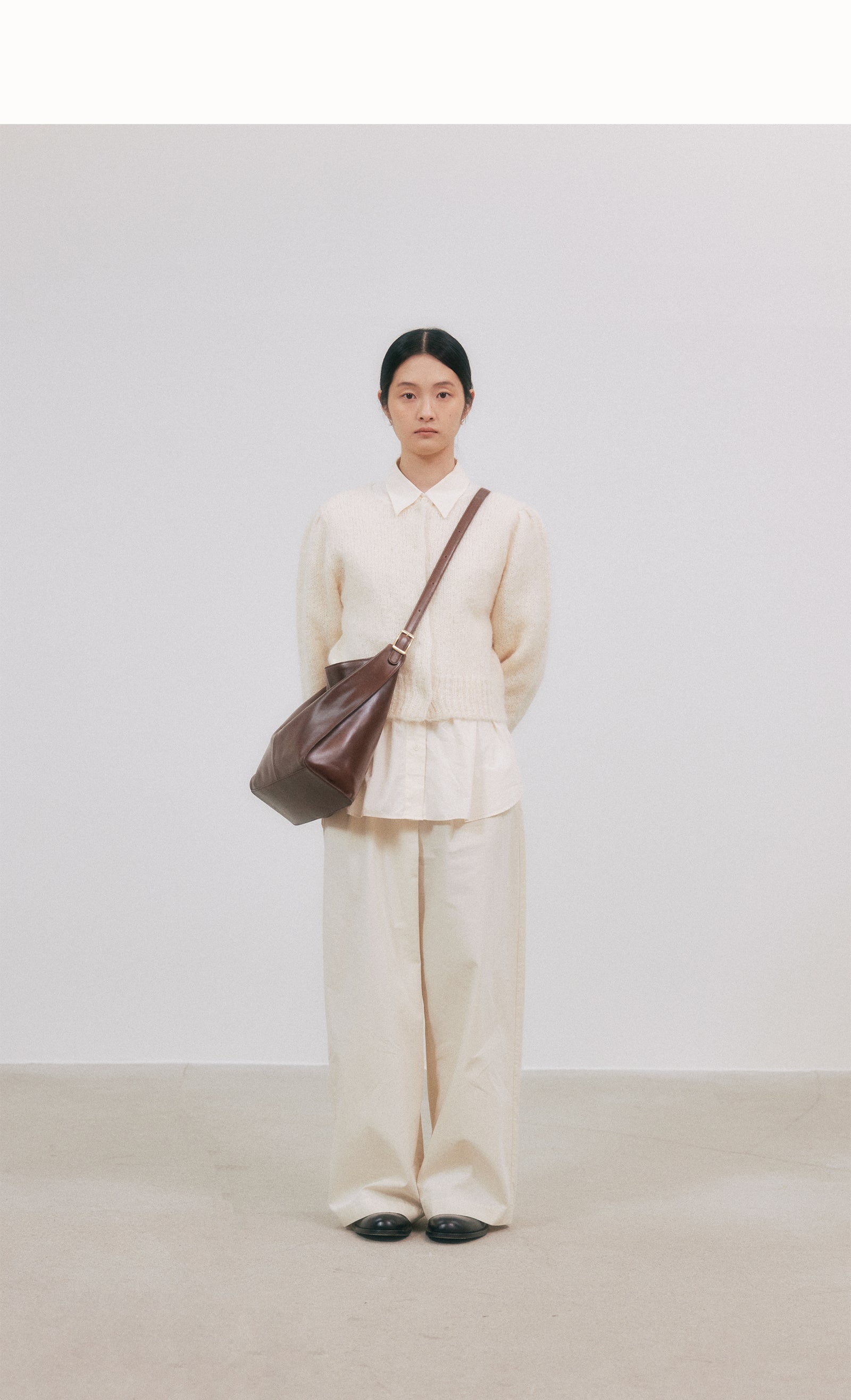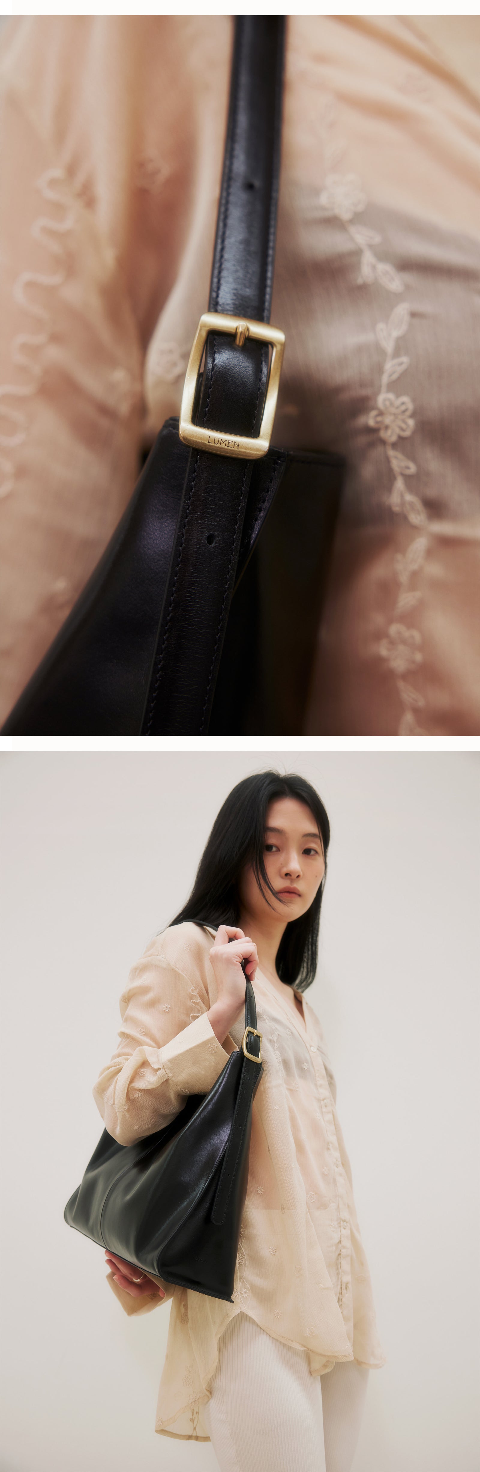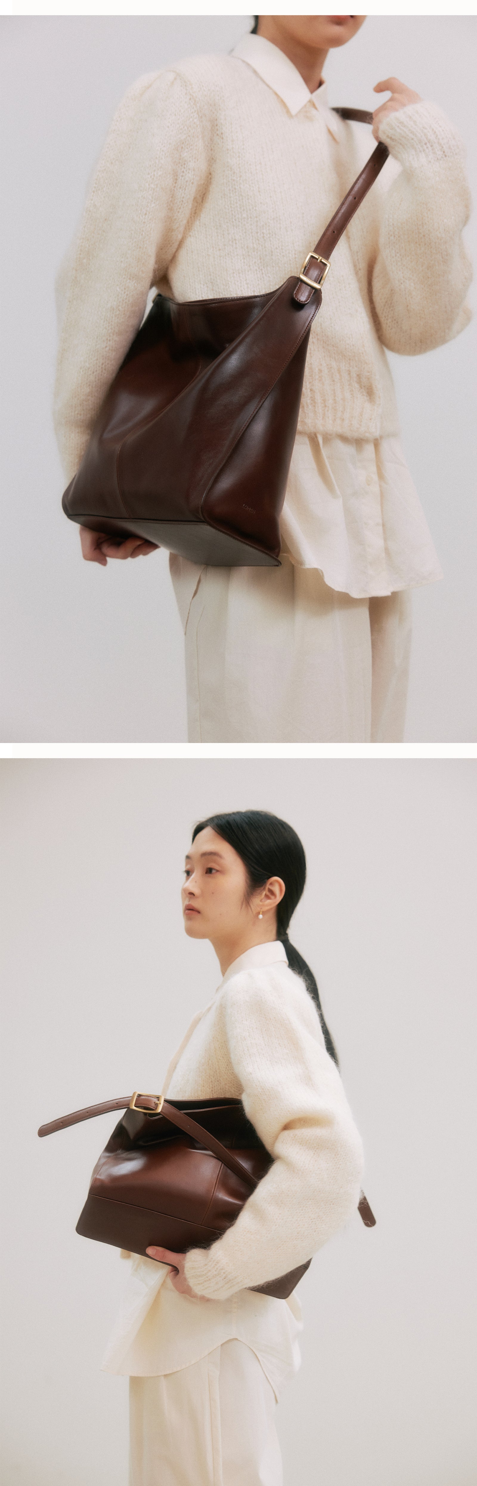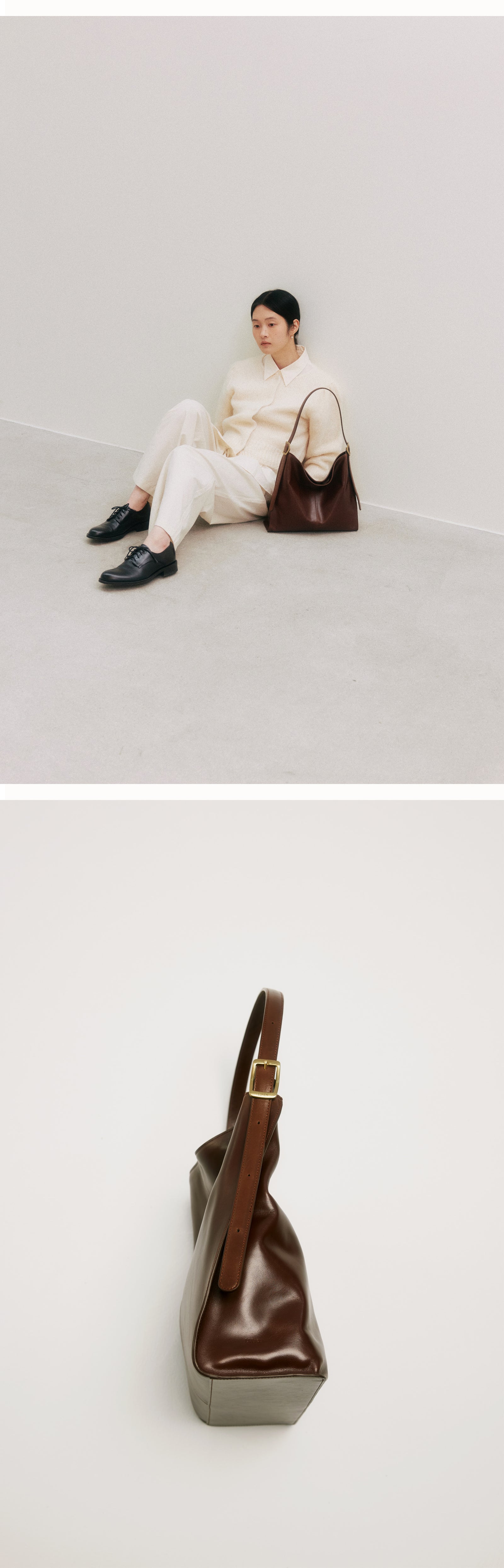 It is an Arete bag that highlights the asymmetric structure of the front and back plate by making an oblique incision on the side.Arete is a French word that means the angle that forms the tangent of a place. The Arete bag is valuable for collection with its cleanliness and unique design.Soft natural oil pull-up cowhide adds style with a subtle luxurious sheen and a natural slick design. It is a good size to use as a daily bag because it can store enough iPads.You can wear it from shoulder to cross.