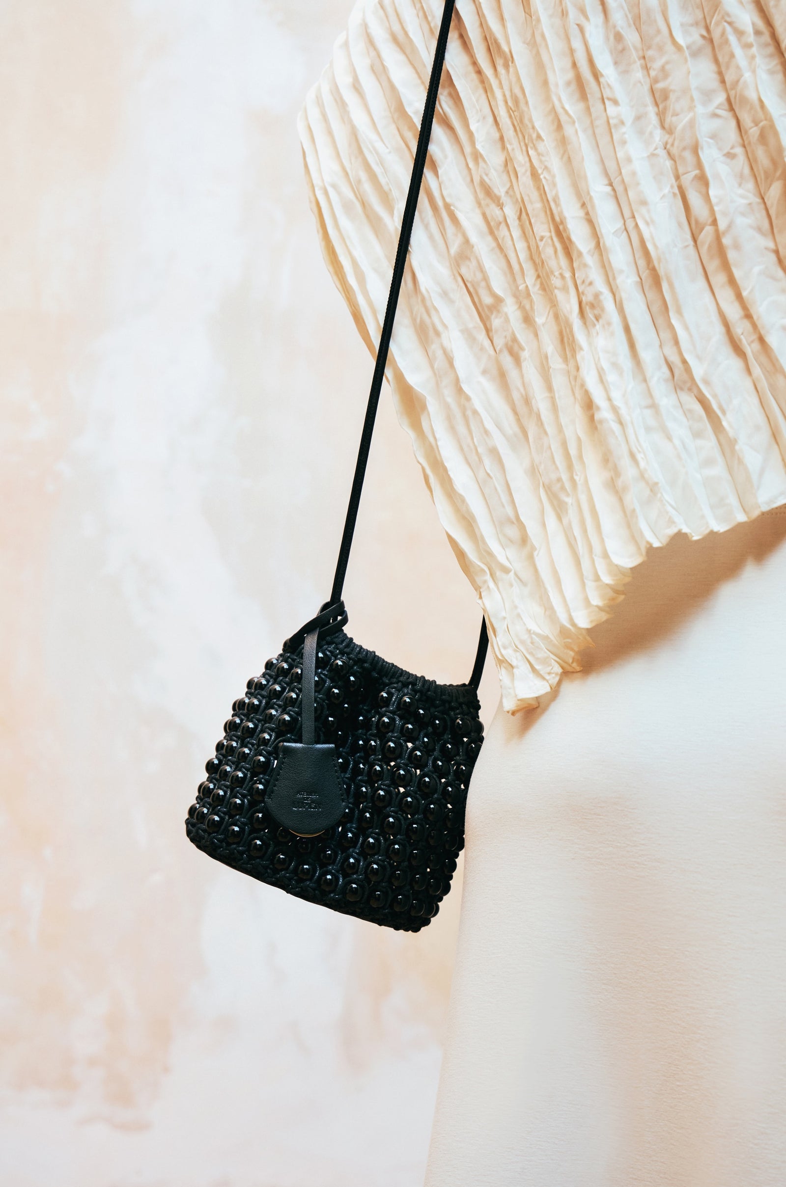 This is a basket-type Bijou bag made by weaving beads. The Bijou bag, which feels like a single object, is made using beads that reflect light and sparkle softly. The beads, which sparkle like glass beads but are made using ABS material that is resistant to shock and heat, are not just decorations but also have the durability required as an outer layer. The basket-type silhouette contains the value of handcraft by carefully stringing beads one by one using coated cotton thread. You can easily open and close it by adjusting the body cross strap, and the shoulder protection patch added to the cross strap further enhances the wearing comfort. The attractive silhouette and texture created by weaving thread and beads are a great design to add a point to your look.