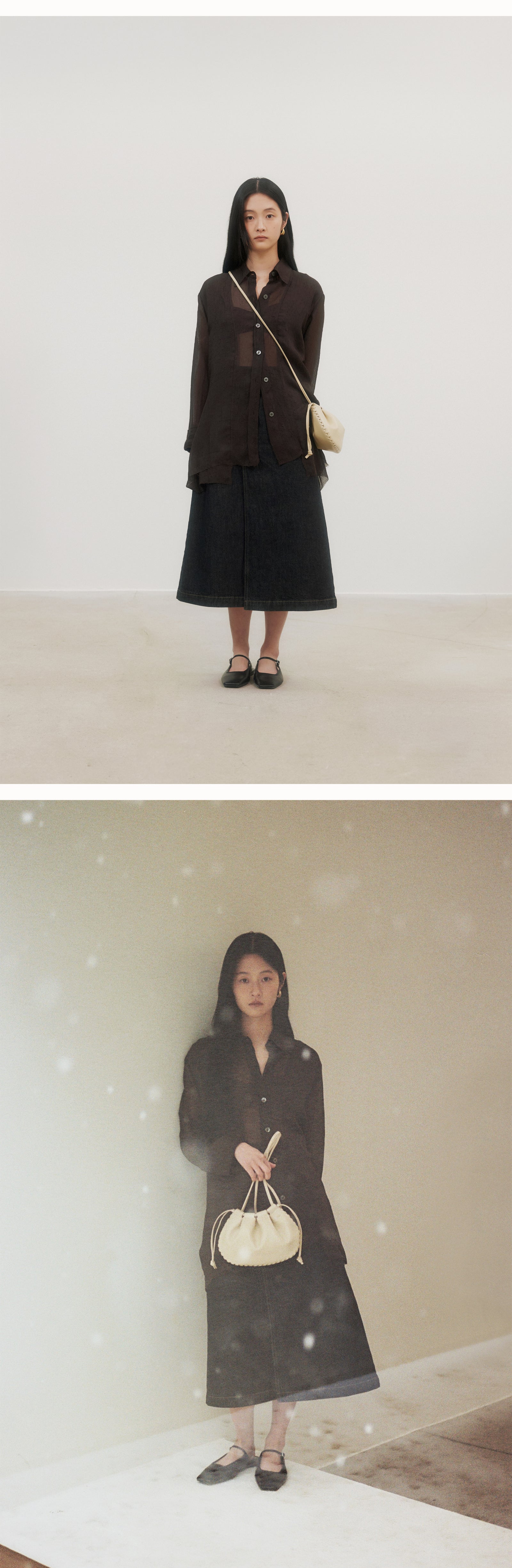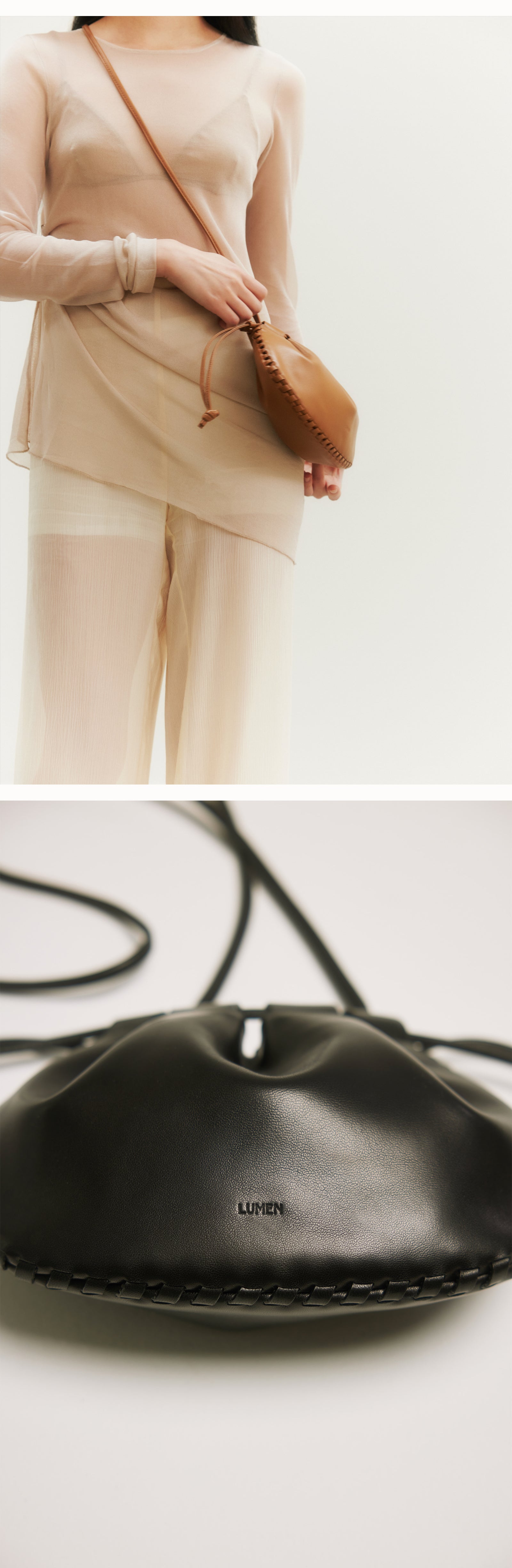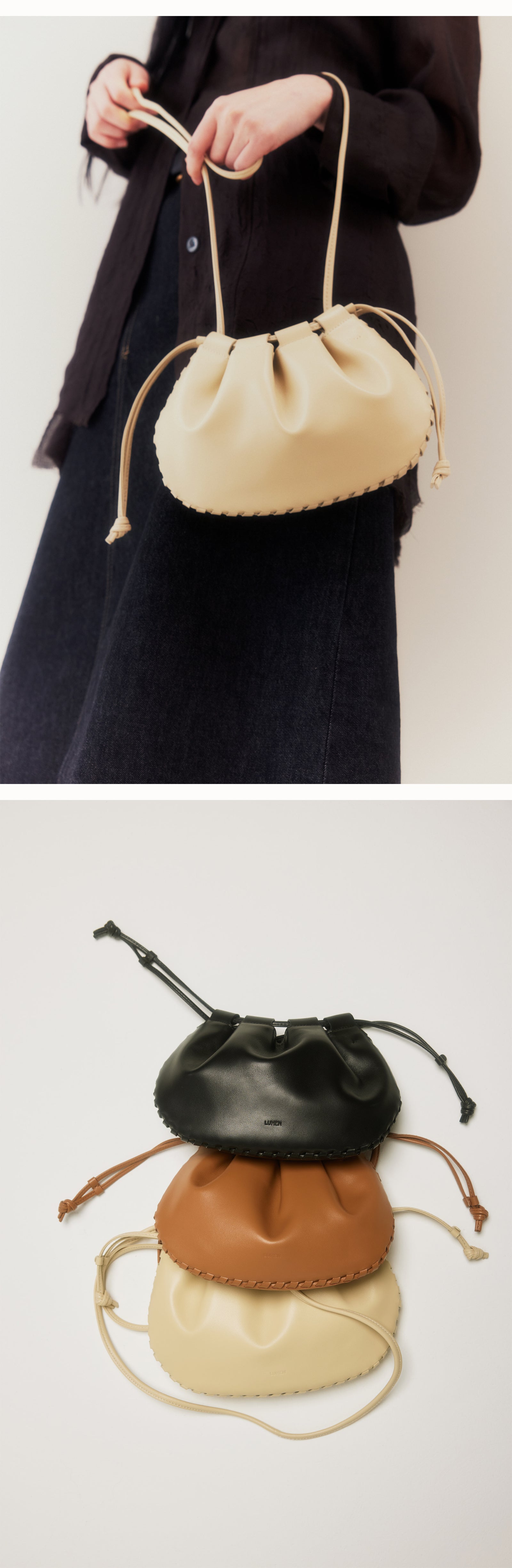 It is a Bon bien bag that features a unique pleated structure and a wippstitch. Bongbiang Bag, which has a free bohemian vibe, uses soft ramskin. It is a drawstring style that opens and closes the tightening strap.It's lightweight at 155g, so you can wear light clothes and light clothes.The strap is adjustable and can be used in two ways: shoulder bag and cross bag.