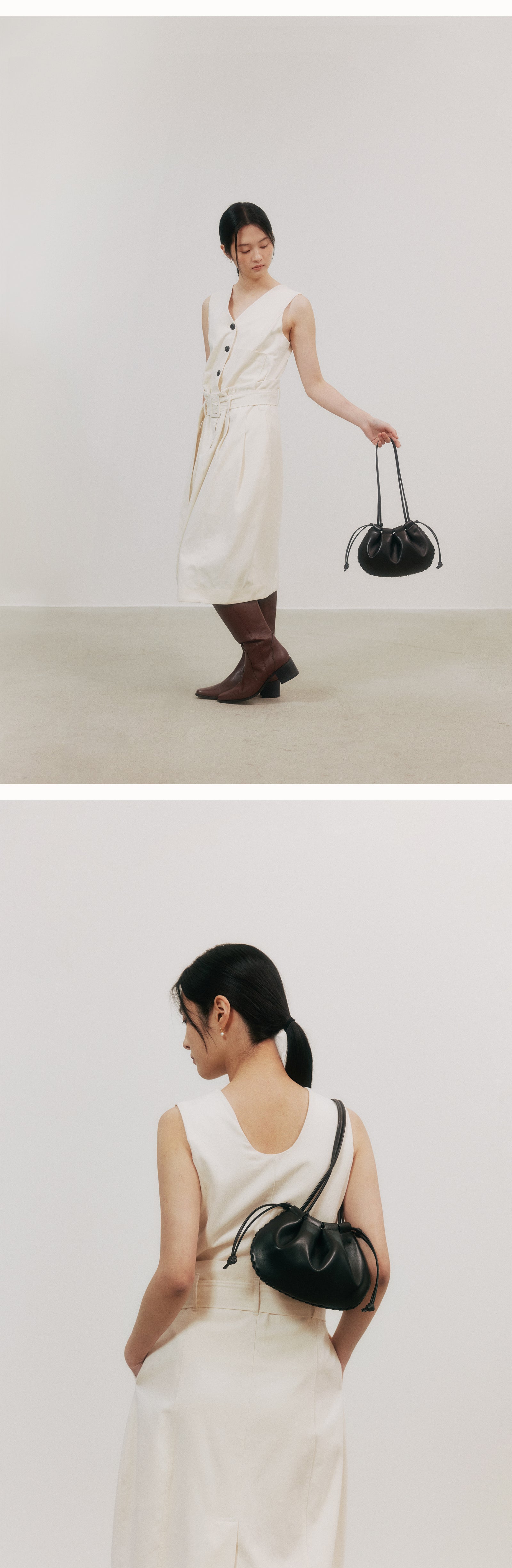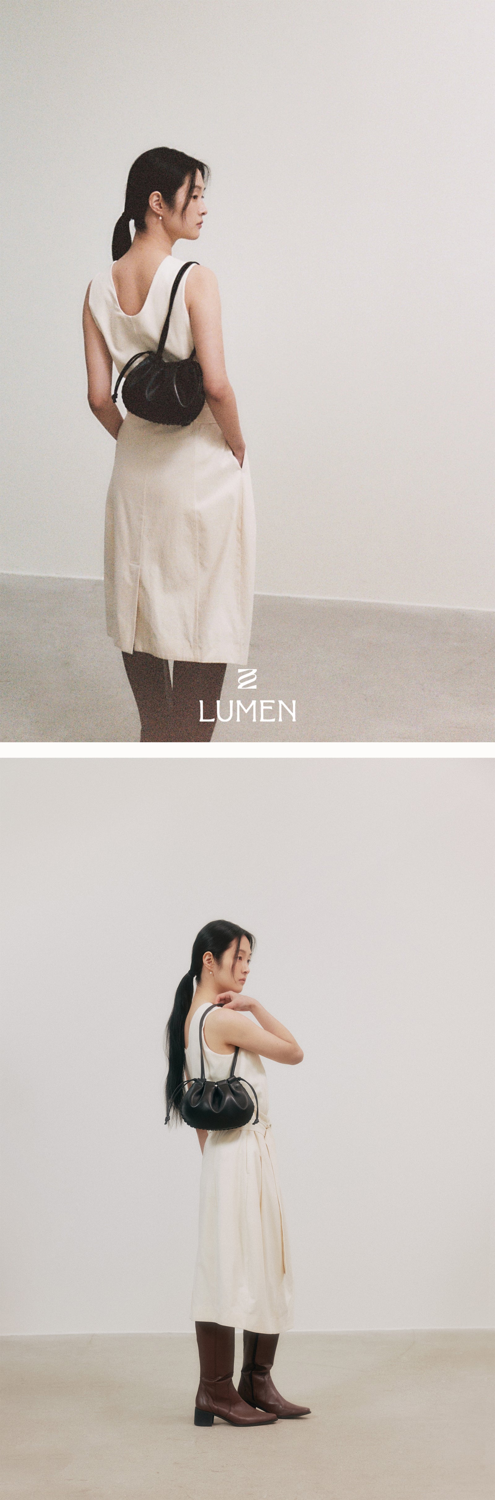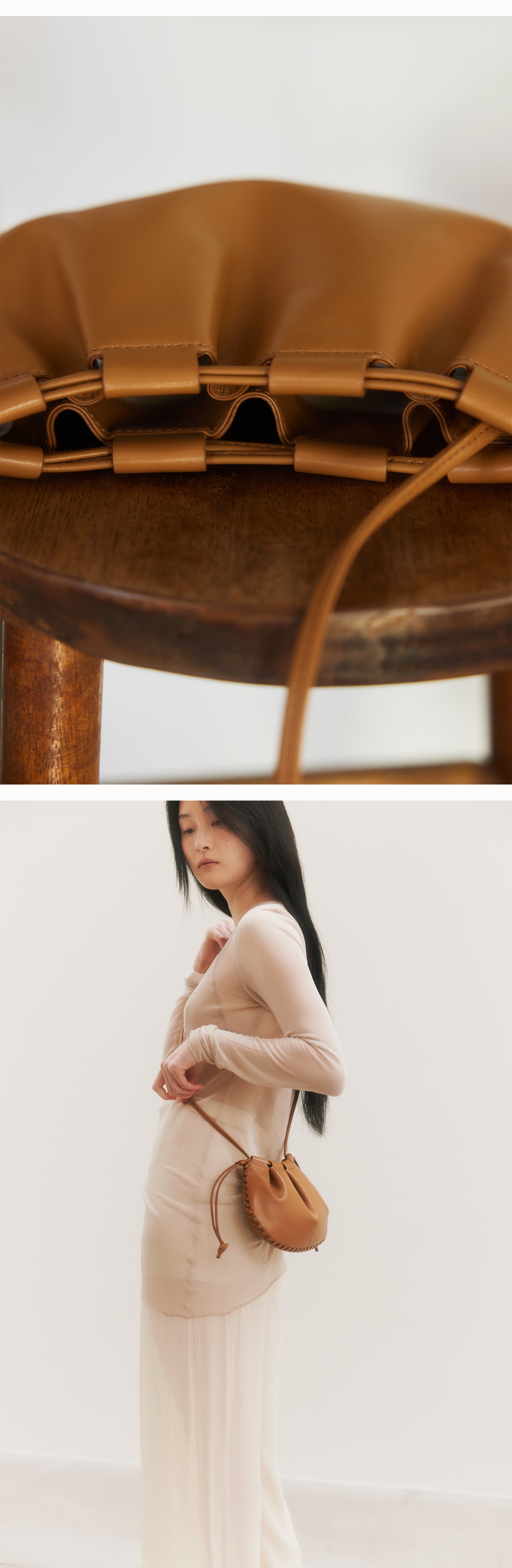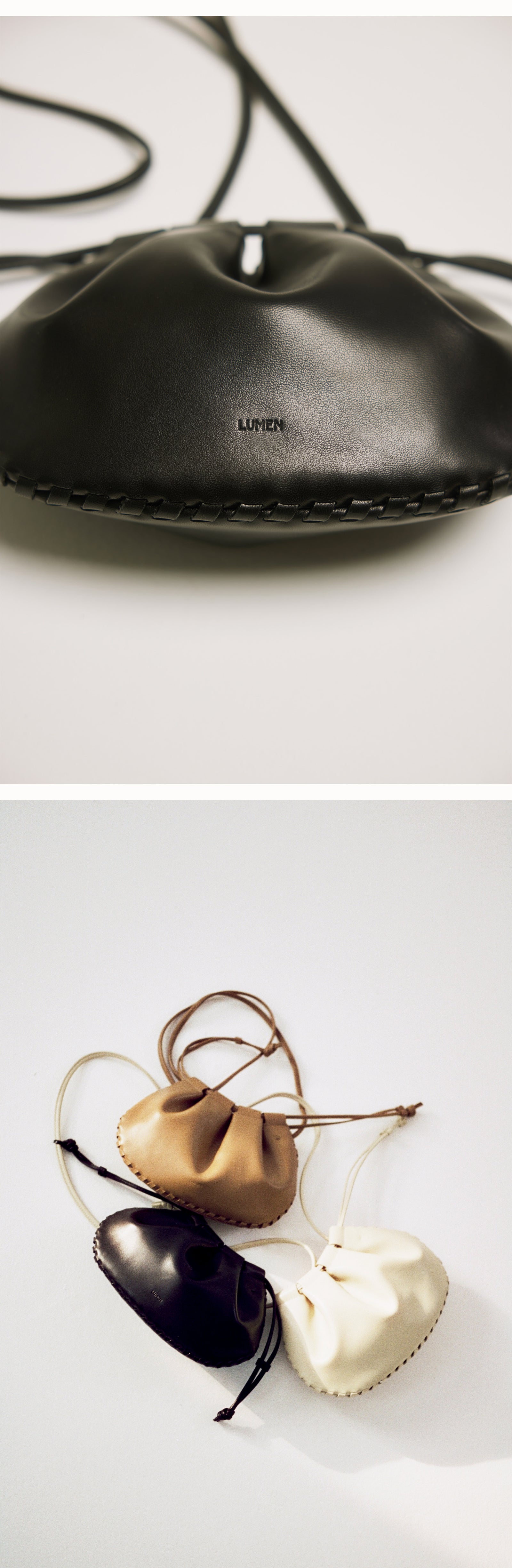 It is a Bon bien bag that features a unique pleated structure and a wippstitch. Bongbiang Bag, which has a free bohemian vibe, uses soft ramskin. It is a drawstring style that opens and closes the tightening strap.It's lightweight at 155g, so you can wear light clothes and light clothes.The strap is adjustable and can be used in two ways: shoulder bag and cross bag.