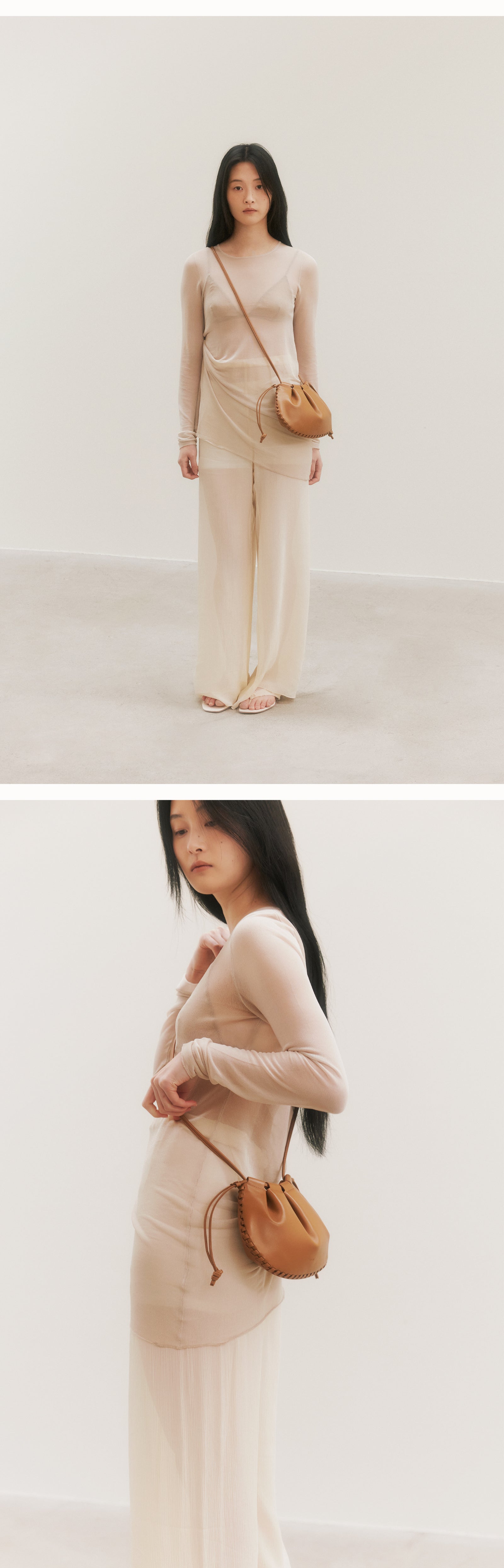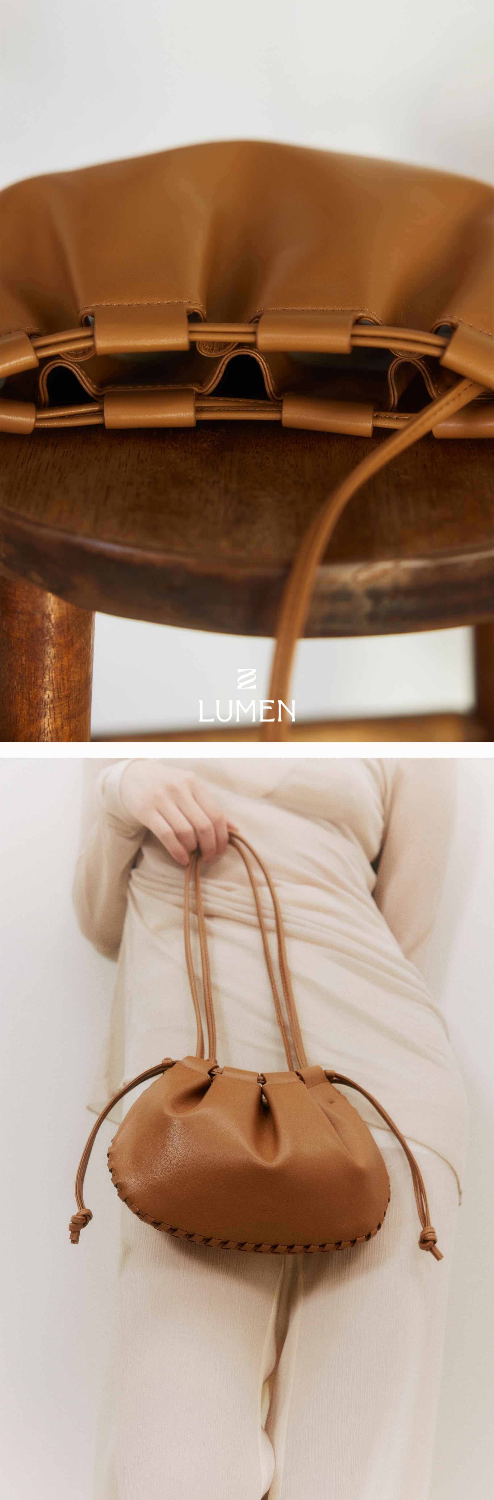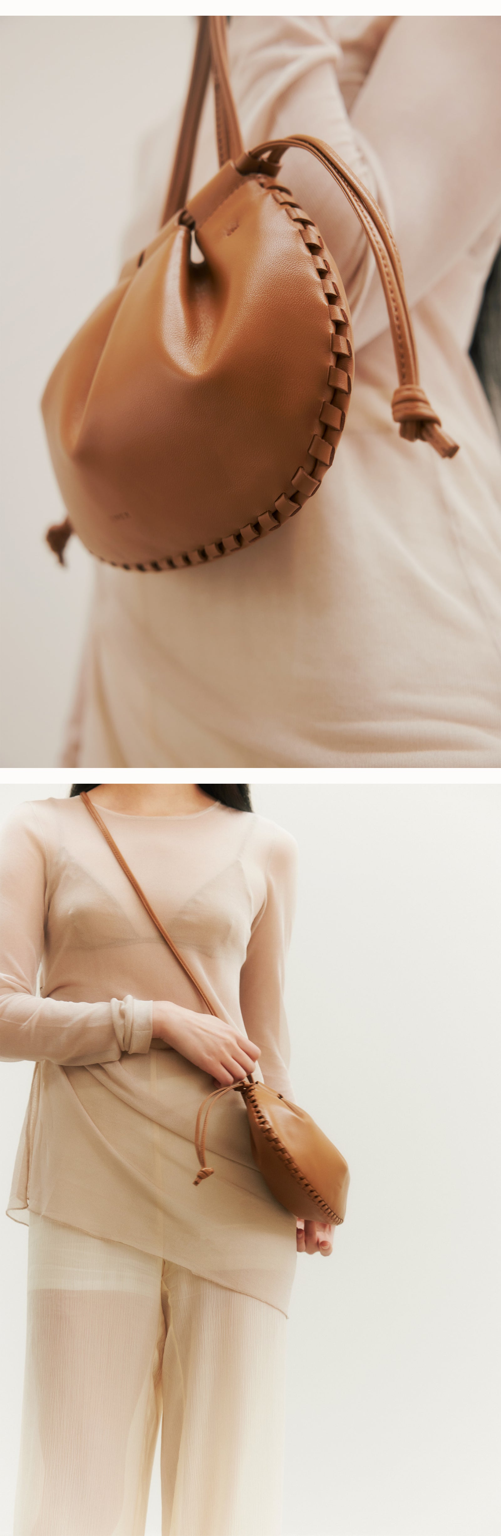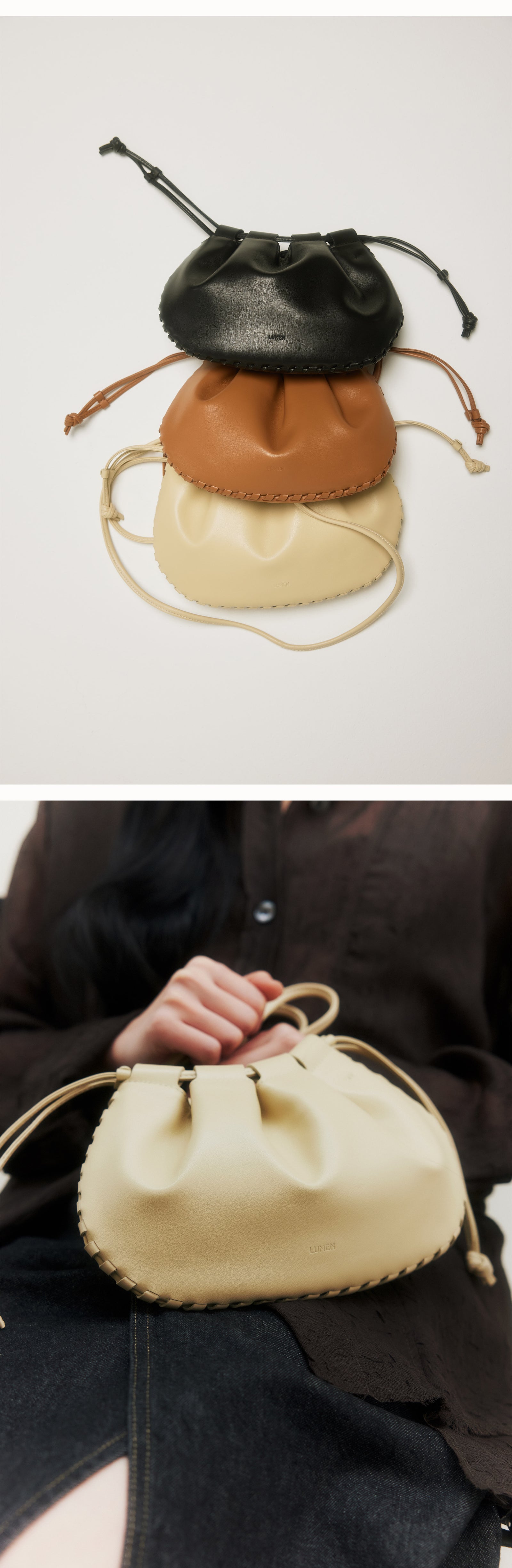 It is a Bon bien bag that features a unique pleated structure and a wippstitch. Bongbiang Bag, which has a free bohemian vibe, uses soft ramskin. It is a drawstring style that opens and closes the tightening strap.It's lightweight at 155g, so you can wear light clothes and light clothes.The strap is adjustable and can be used in two ways: shoulder bag and cross bag.