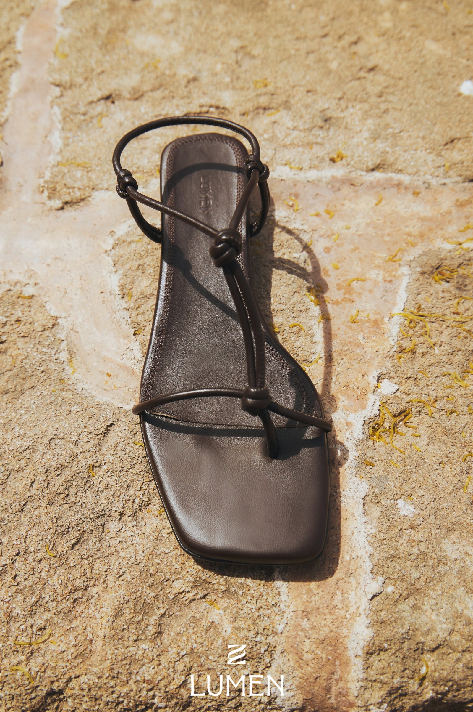 The Corda sandal is a harmonious combination of a minimal silhouette that makes use of space and knot details. The curved strap line that flows gently along the instep and the knot created by connecting the straps create a simple yet beautiful silhouette. The angular outsole line with a square toe shape emphasizes a modern mood, and the points of the knot and the lines of the straps as planes form the design's point, line, and plane elements. The light weight derived from the simple structure and the design through delicate calculations provide a comfortable yet stable fit. The heel height is about 1.5 cm, and we recommend purchasing the regular size.