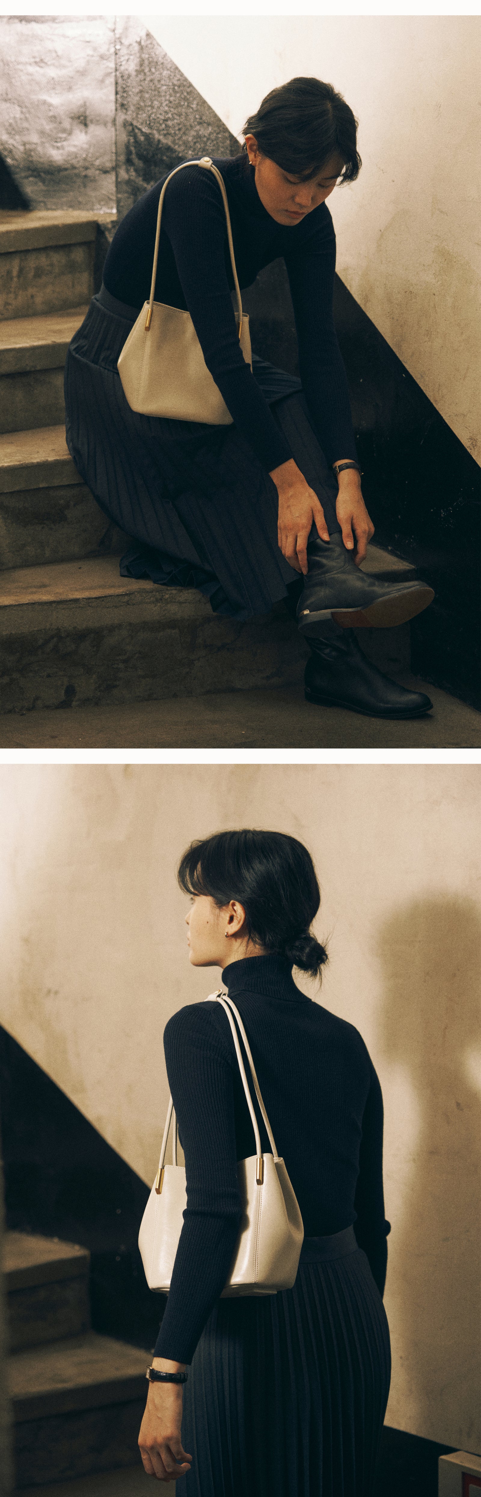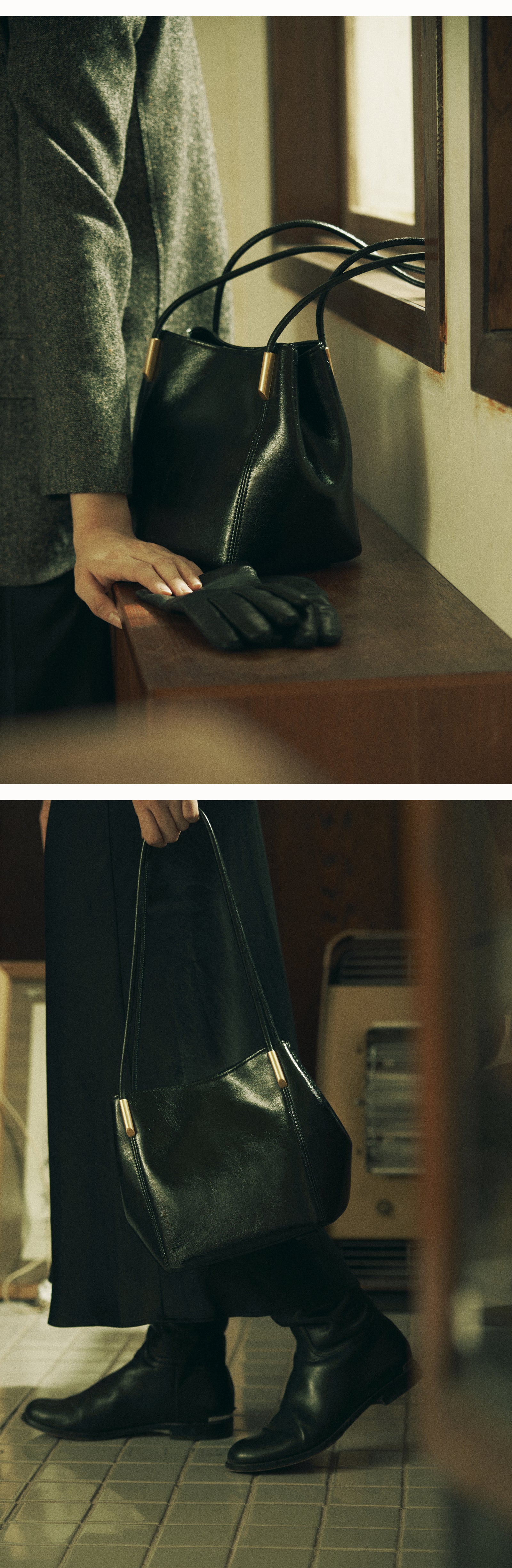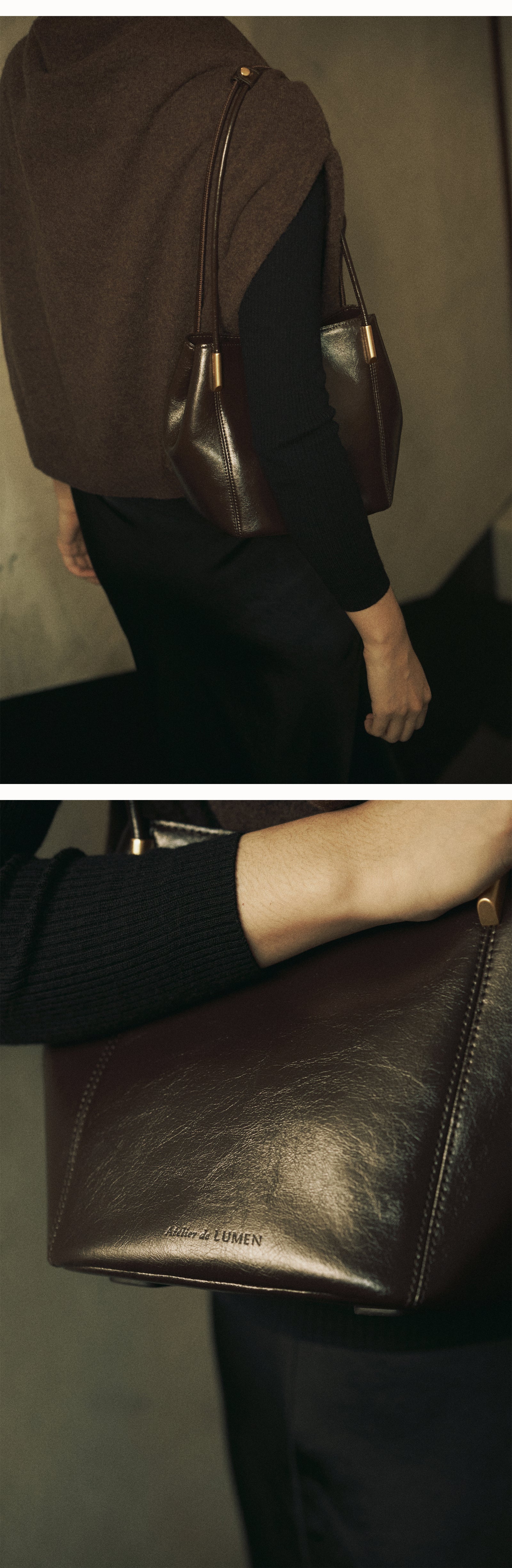 The gold pipe decoration with the leather handle, which stands out with the sewing lines,It is a Marron bag with a harmonious silhouette created by shirring on both sides of the compact body.The subtle glossy leather further highlights the deep color of the classic mood. The long tote length allows you to wear a tote and shoulder, and there is a relaxed space inside and a zipper pocket for comfortable use. With a sophisticated femininity, the Maron bag adds a deep atmosphere to the outfit.