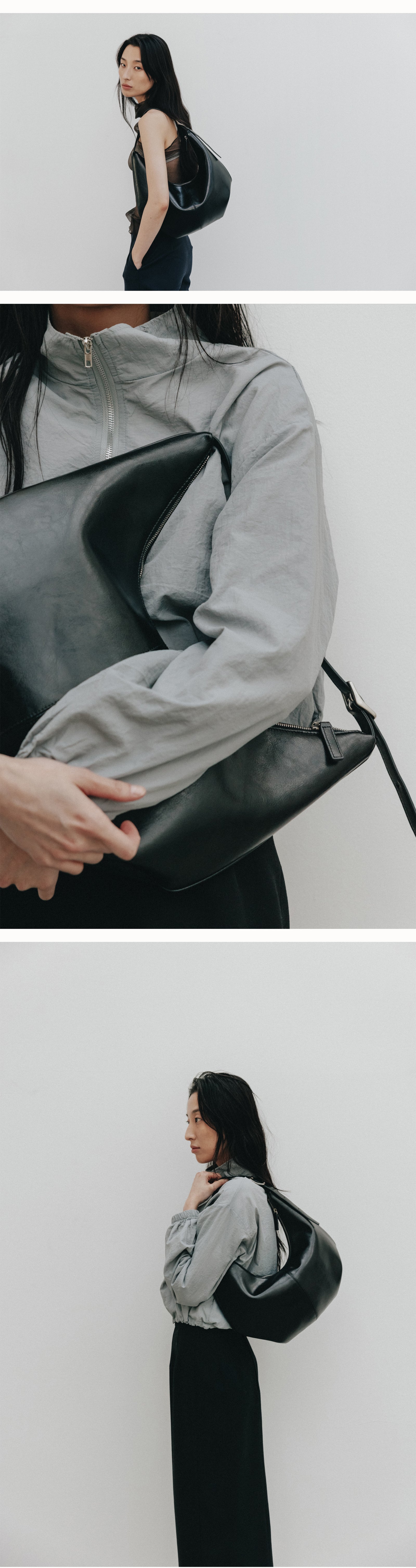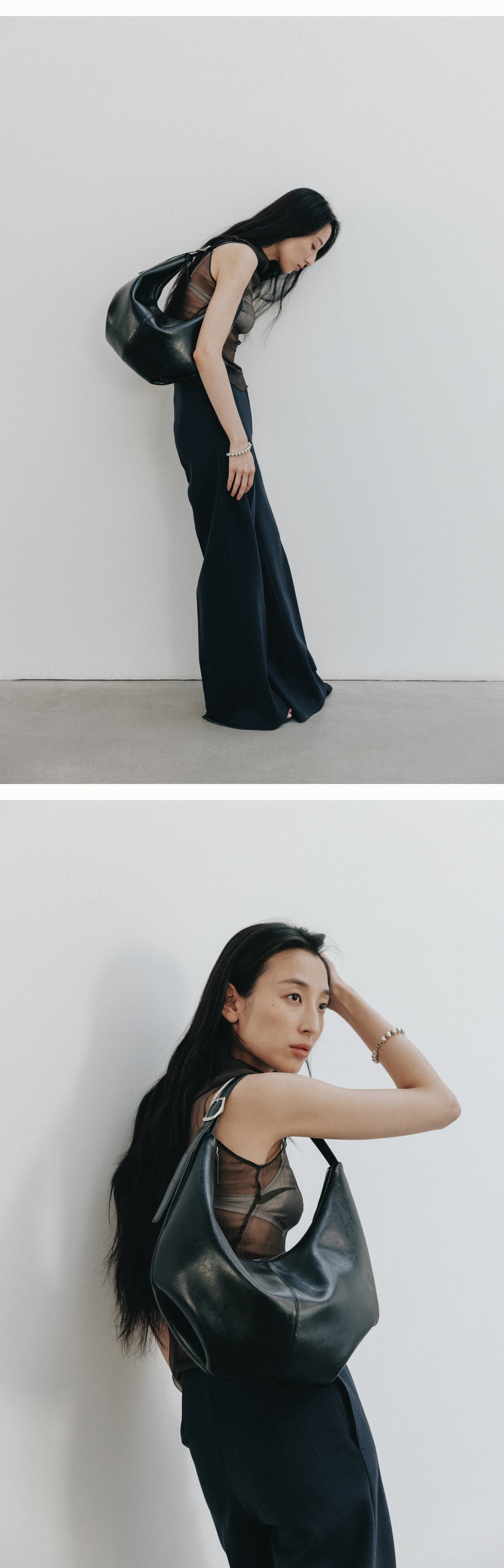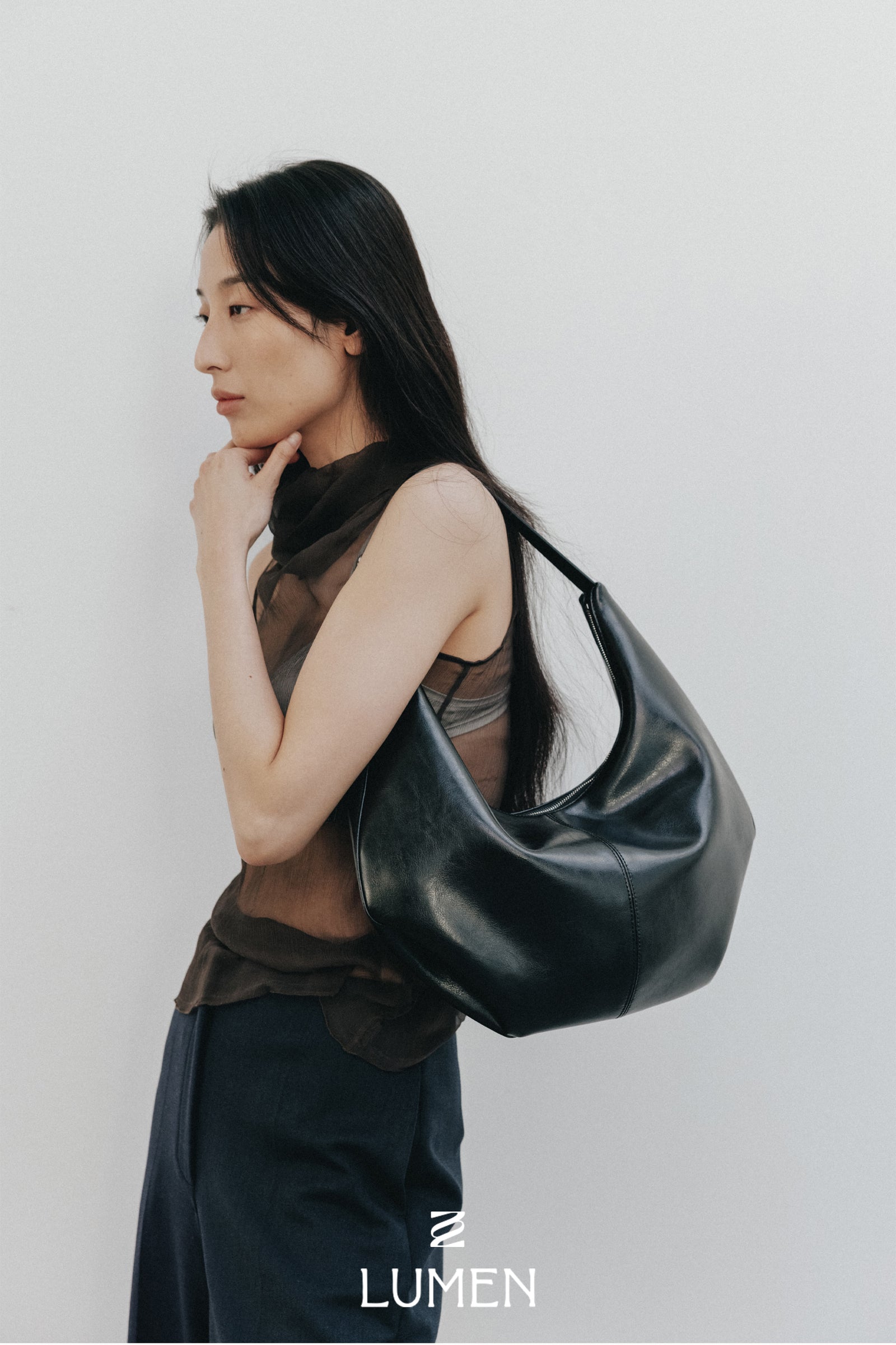 This is a Mossy hobo bag with a unique structure that is attractive. The Mossy hobo bag, which has a volume shape with a structure where the sides fold in, is made of black cowhide with a soft sheen and soft sand-colored suede. It is light and soft with ample storage space, making it comfortable to wear. The buckle decoration of Lumen, which has a surface treatment on nickel, allows for length adjustment.