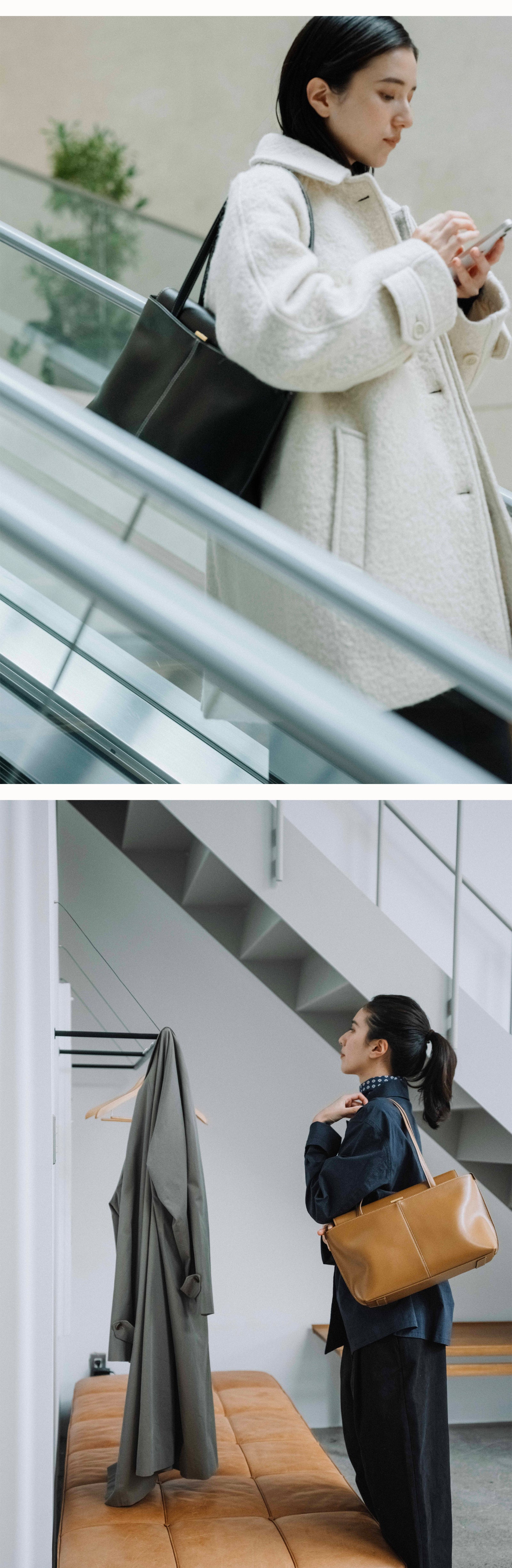 This is a Panier flap bag that stands out for its minimalist structure. The flap that closes inward completes the simple design, and it can be opened and closed conveniently using a magnet. The lock bar decoration on the front has the Lumen logo engraved on it for a classic feel. It is a daily shoulder bag that can store an iPad and goes well with any everyday outfit.