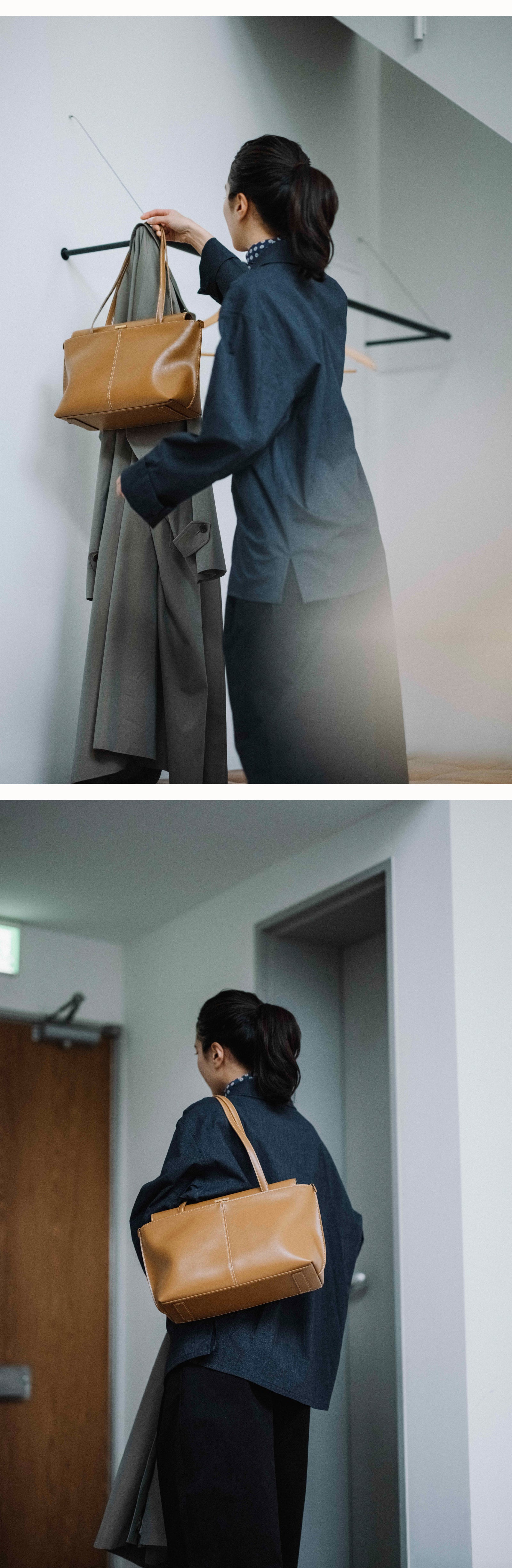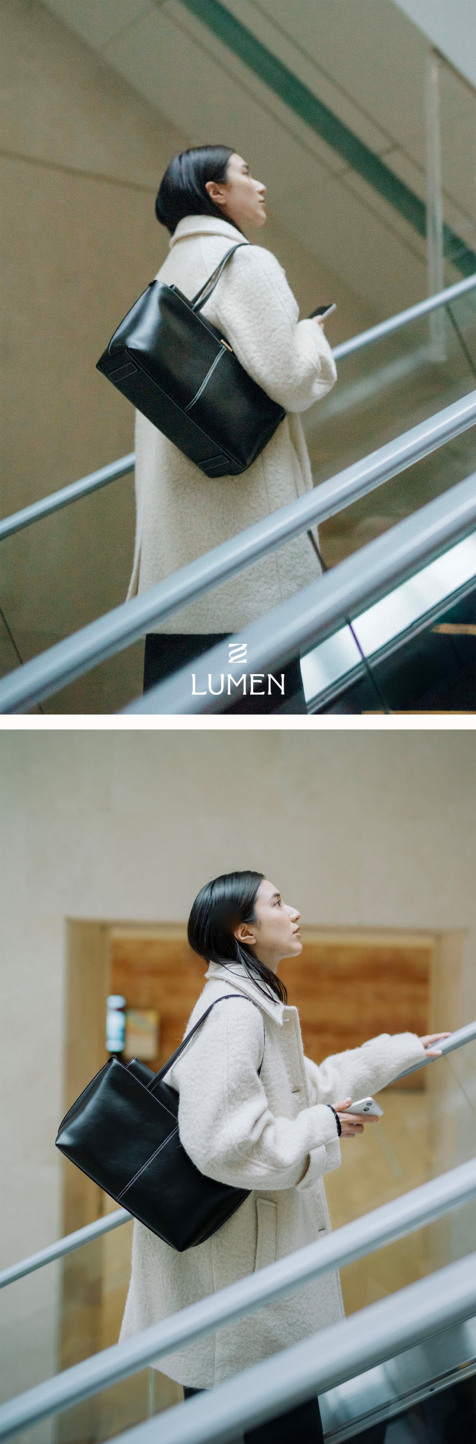 This is a Panier flap bag that stands out for its minimalist structure. The flap that closes inward completes the simple design, and it can be opened and closed conveniently using a magnet. The lock bar decoration on the front has the Lumen logo engraved on it for a classic feel. It is a daily shoulder bag that can store an iPad and goes well with any everyday outfit.