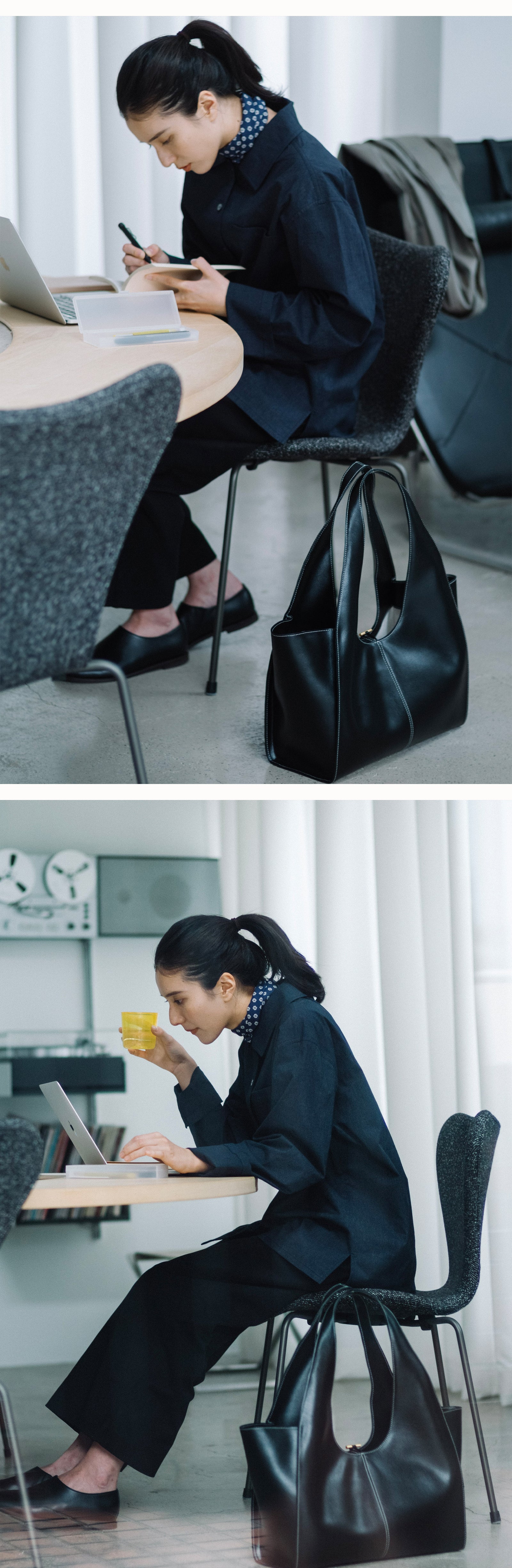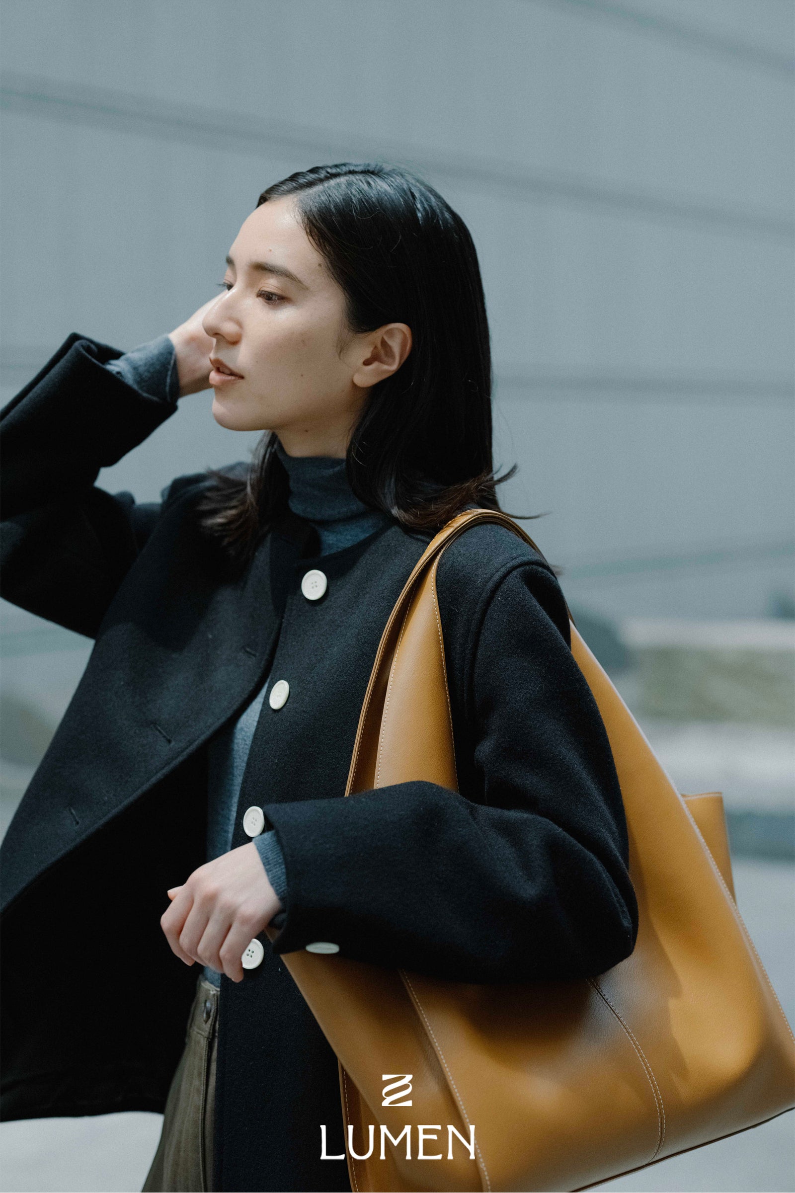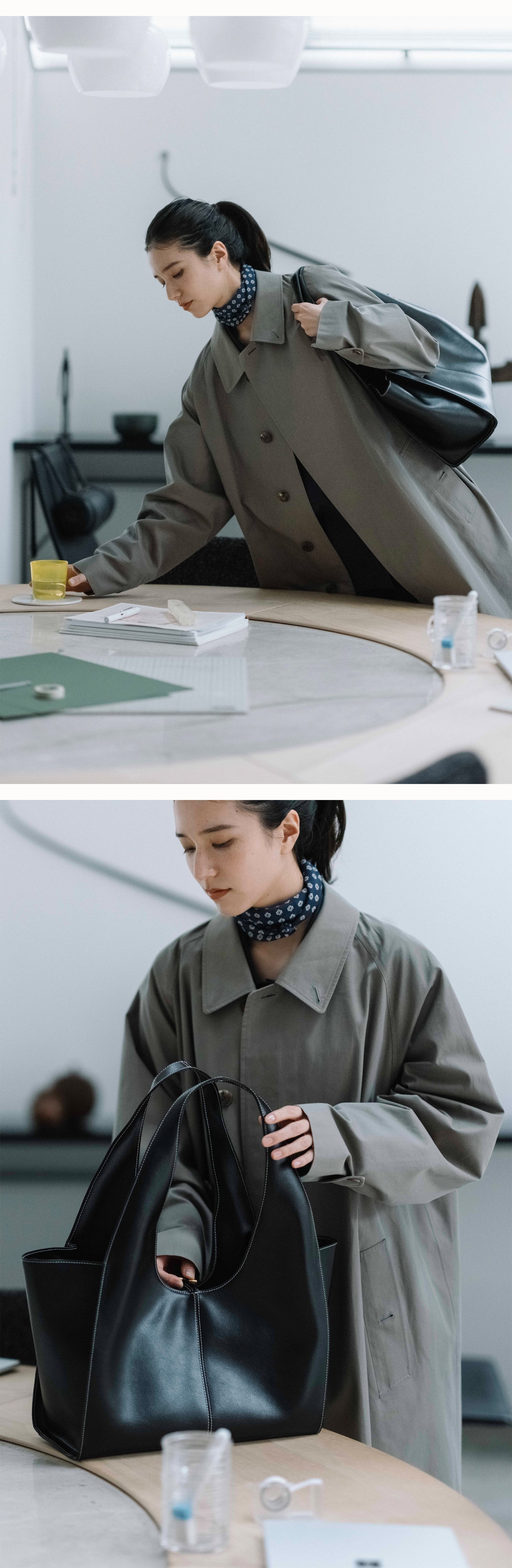 This is the Panier grand bag, a big size of Lumen's best-selling panier bag. Like the panier bag, it opens and closes using the leather ring at the top, and the subtle gold decoration on the front has the logo of Atelier de Lumen engraved on it for a classic feel. The oversized grand bag with a casual chic feel can store a 13-inch laptop and more. It is a practical product with open pockets and zipper pockets on the front and back, and the side wings can be put in and taken out, allowing for a variety of styling options. The suede brown color creates a stylish shape with a soft touch and flexible form. The simple decoration with surface treatment on nickel and the handle designed to naturally roll inward provide a more comfortable fit.