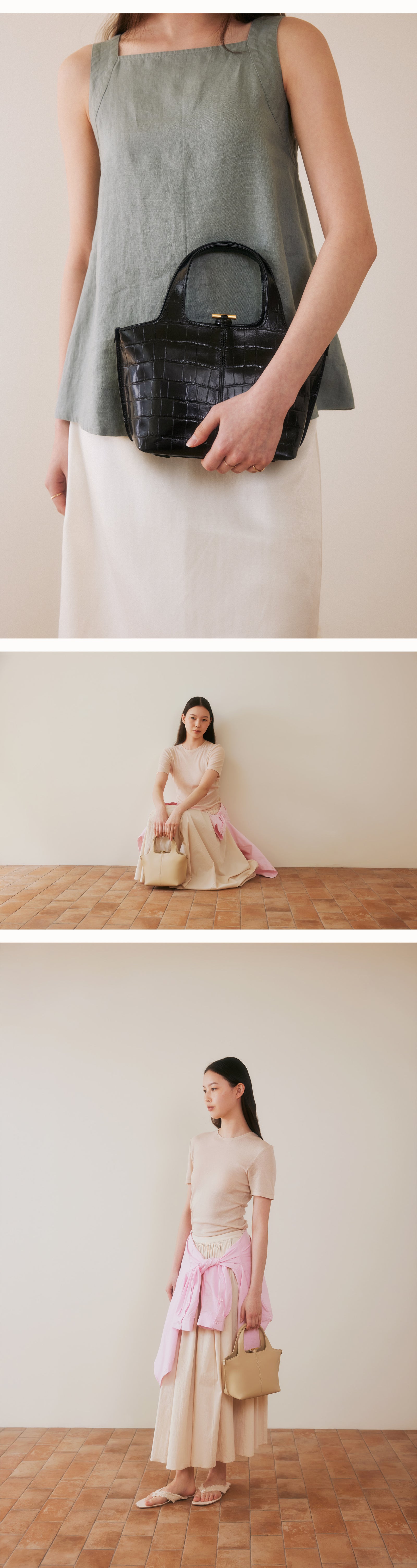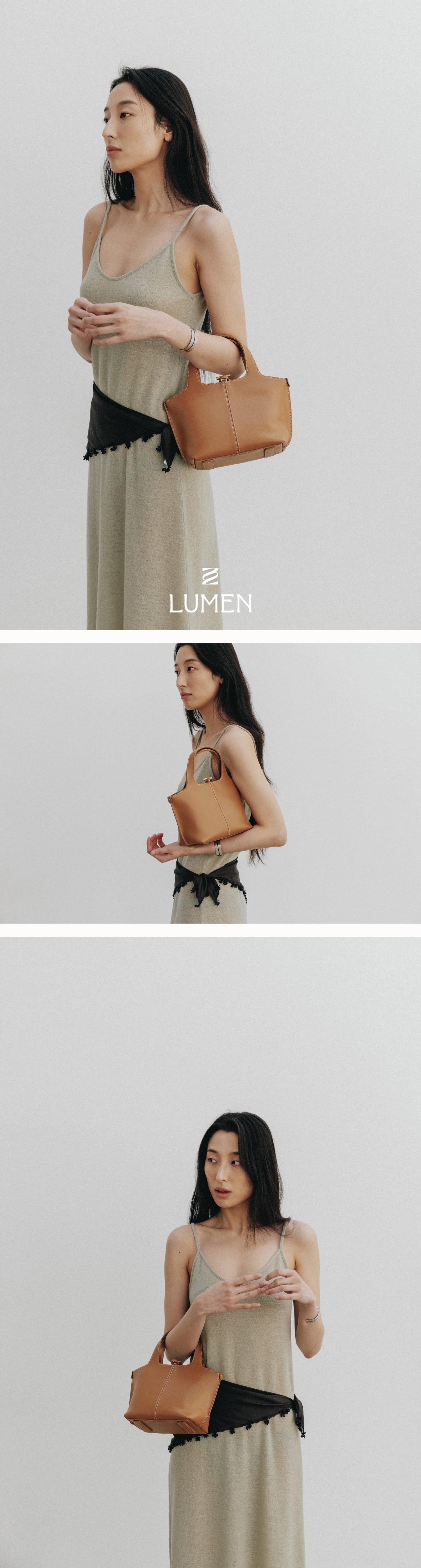 The stitches on the leather are harmoniously shaped like small baskets. It's a Panier petit bag. It is opened and closed using a leather ring on the back, and the soft gold decoration on the front is Atelier de Lumen's logo is engraved to add classicity. There are open pockets and zipper pockets on the inside and back for practical storage. It's a small top handle that goes well with any outfit in your daily life.This is a product.