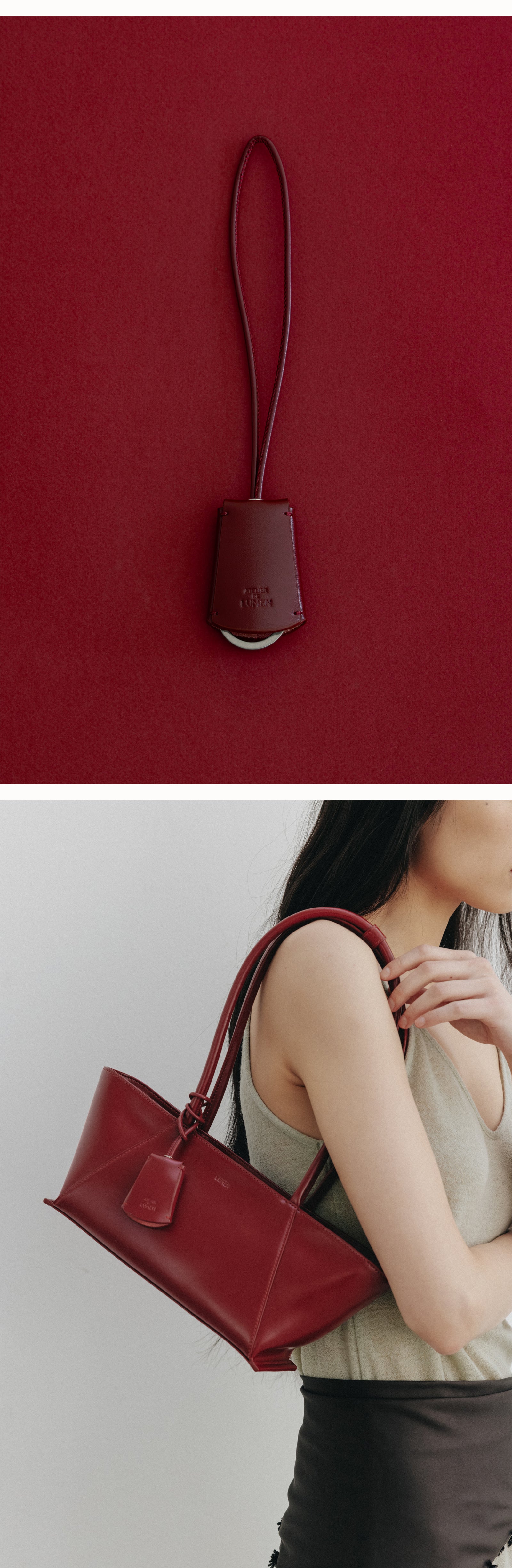 This Rondelle charm has stitching between the overlapping leather to give it a point. It can be hung on a handbag to add a point, and can be layered with keys or additional key rings to create a stylish look. This charm decoration stands out for its practicality with its simple design and lightweight structure.