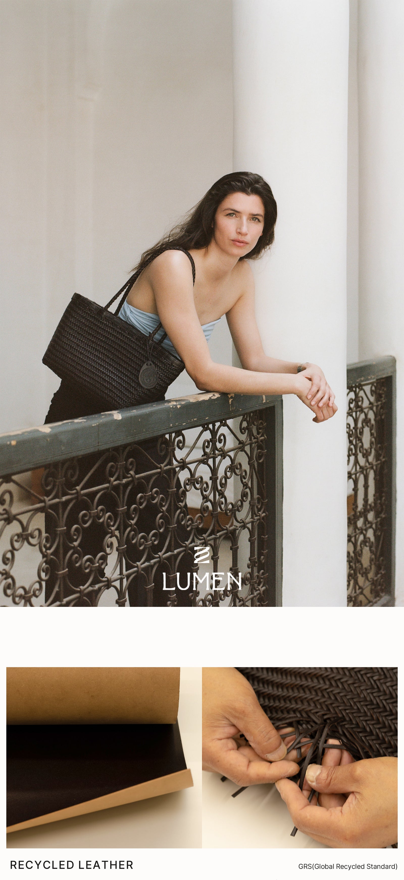 This is a Twig bag, woven strand by strand by hand. The intricately woven Twig bag is made of eco-friendly recycled leather that has been reprocessed from discarded leather. The Twig bag is a shoulder bag with a shape that is easy to store and is lightweight, making it comfortable to use. The belt detail is a focal point, and the Lumen illustration logo engraved on the hanging charm adds to the value of handcraft.